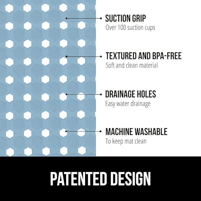 - PATENTED DESIGN WITH POWERFUL SUCTION GRIP: a shower mat designed to securely stay in place; the patented mat features hundreds of suction cups that effectively help secure the mat to your tub or shower floor