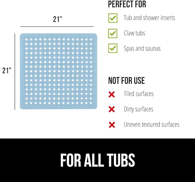 - OVERSIZED AND MACHINE WASHABLE: the shower mat is so easy to clean, simply machine wash and air dry; you can easily air dry the shower mat by hanging it over the side of the tub; square mat is conveniently sized 21” x 21” providing excellent coverage for standing showers