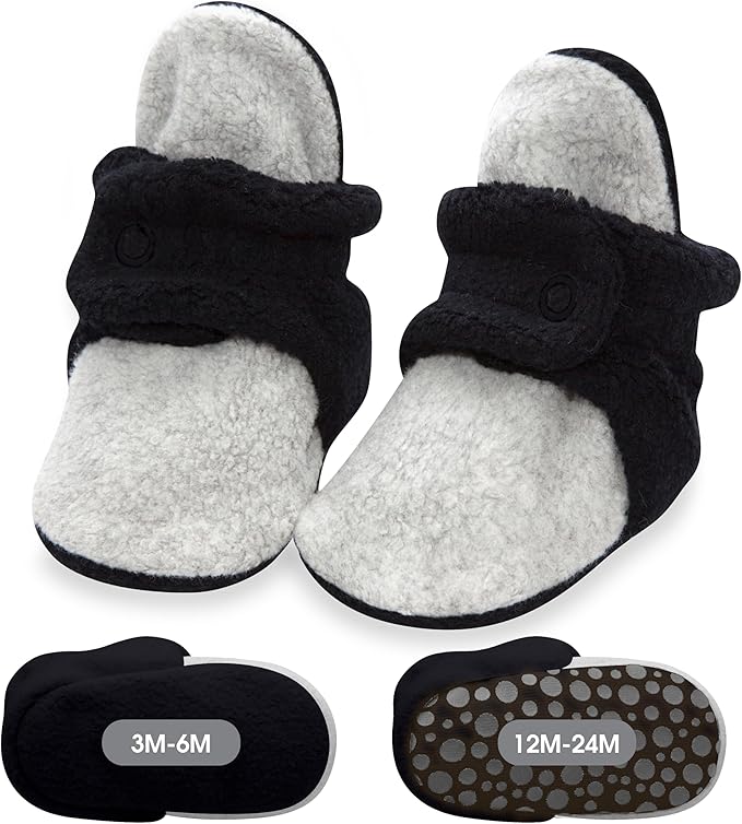 - BABY BOOTIES THAT STAY ON: Our 2-snap booties offer a comfy fit and stay securely on your little one’s feet, no matter their activity level. From kicking in a stroller to crawling on the floor, your baby can play without losing these booties.