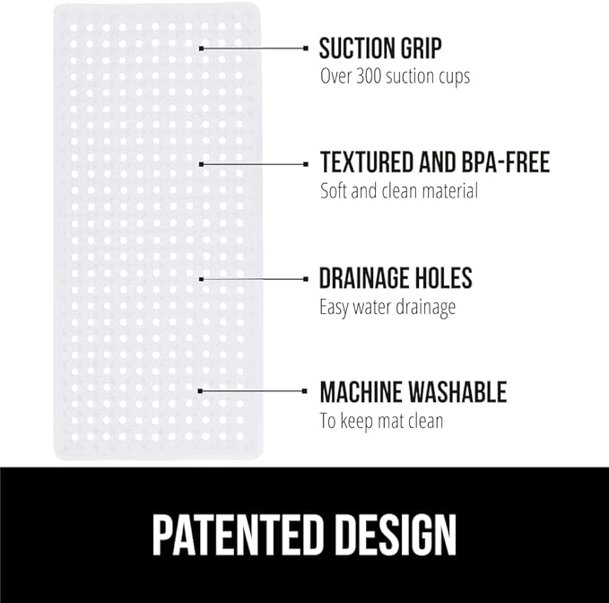 - PATENTED DESIGN WITH POWERFUL SUCTION GRIP: a bath mat designed to securely stay in place; this patented bathtub mat features hundreds of suction cups that effectively help secure the tub mat to your shower floor