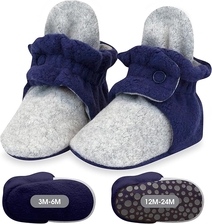 - STAY ON FEET: Our 2-snap booties with nonslip grippers stay securely on feet and help new walkers grip slippery tile or hardwood floors. Whether your little one is kicking or crawling, these fleece booties won’t go missing like loose baby socks!