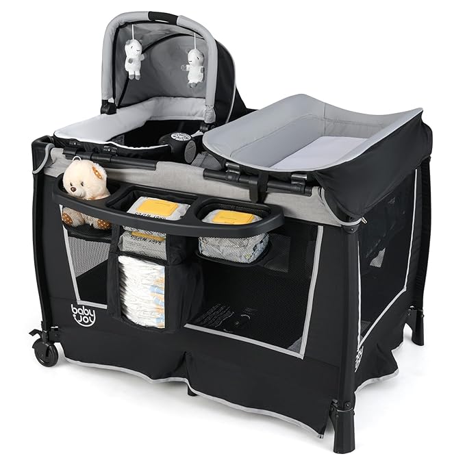 BABY JOY 5 in 1 Pack and Play, Portable Nursery Center Baby Playard w/Bassinet & Diaper Changing Table, Infant Bassinet Activity Center with Toys, Music, Oxford Bag for Toddlers (Space Grey, Classic)