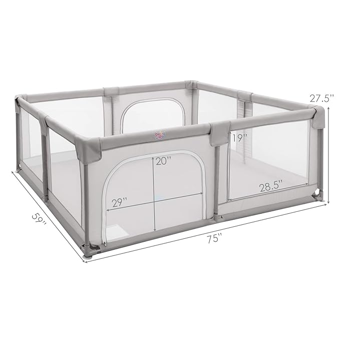 - 【Perfect Size Play Area & Scientific Height】Our baby playpen with the dimensions of 75'' x 59'' x 27.5'', and provides safety playing space for baby. It's perfect for compact room or traveling to use. The additional four rings and height of the fence is high enough for the baby to stand & walk while having enough area inside the play pen to explore around.