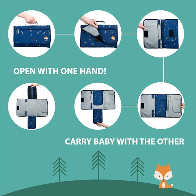 - SINGLE HANDED CONVENIENCE: With its rapid-open hook and loop fastener, customized 100x Wipes Pocket, minimum 5x Diapers Pocket and Zippered “Foxy Lil Things” Pocket -- the Lil Fox Portable Diaper Changing Pad is the ONLY pad that leaves you one hand to hold baby, and the other for their changing mat for a quick nimble change!