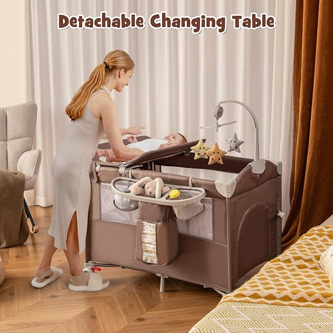 HONEY JOY Pack and Play with Bassinet, 5-in-1 Baby Bedside Sleeper w/Diaper Changing Table & Storage Bag, Toy Arch & Music Box, Detachable Side Rail, Portable Baby Play Yard w/Carry Bag(Coffee)