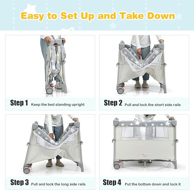 - 👶【Folding Baby Play Yard with Carrying Bag】This portable folding travel bassinet is simply convenient to move thanks to the folding design, and you can take it anywhere with the supplied carry bag. It was super easy to set up with the instructions, you're supposed to lock the sides before you push down the middle. And two wheels with brakes is available to move around with you and make an easy stop when required to keep your baby safe.