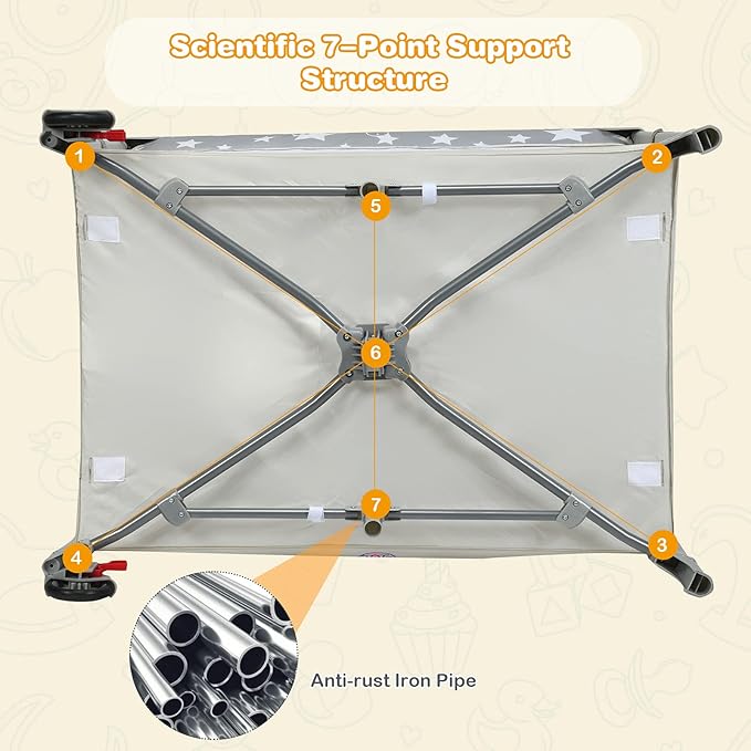 - 👶【Sturdy Frame & Breathable Fabric】Made of sturdy steel pipe, the whole structure of this pack and play is durable for longer use. The 7-point supporting structure on the bottom comes with more steadiness. Both sides with breathable mesh net provide well air circulation as well as an open view to take care of your baby from anywhere in the room.