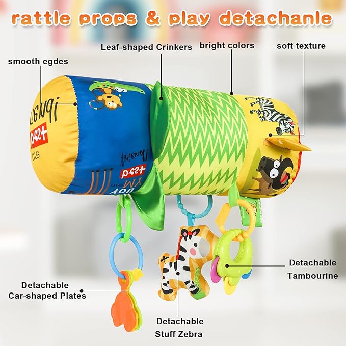 - Rattle Props & Play-along Detachables: This tummytime roller is packed with activities and features to keep babies entertained. Three detachable attachments are included to attract babies' attention and for them to play along with, including a mini tambourine, a stuffed animal zebra and a set of three multi-color car-shaped plates. Baby can enjoy longer and more active tummy time with this pillow. The built-in leaf-shaped rattles also appeal to baby's sense of hearing