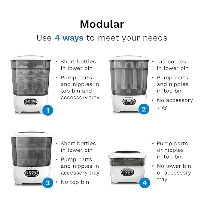 - MOST MODULAR 3-LAYER DESIGN: Use 4 different ways to meet your needs – Only Sterilizer Dryer with large lower bin, shorter upper bin and unique accessory tray; More convenient and easier to use than microwave sterilizer bags or UV sanitizers