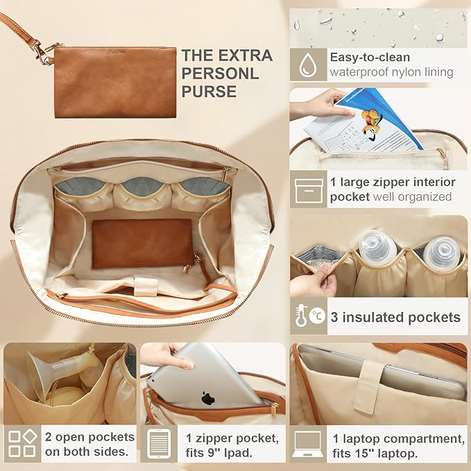 miss fong Large Diaper Bag Tote Pregnancy Hospital Bag Leather Diaper Bag,Baby Tote Bag with 9 Pockets Mommy Bag with Small Purse-Brown