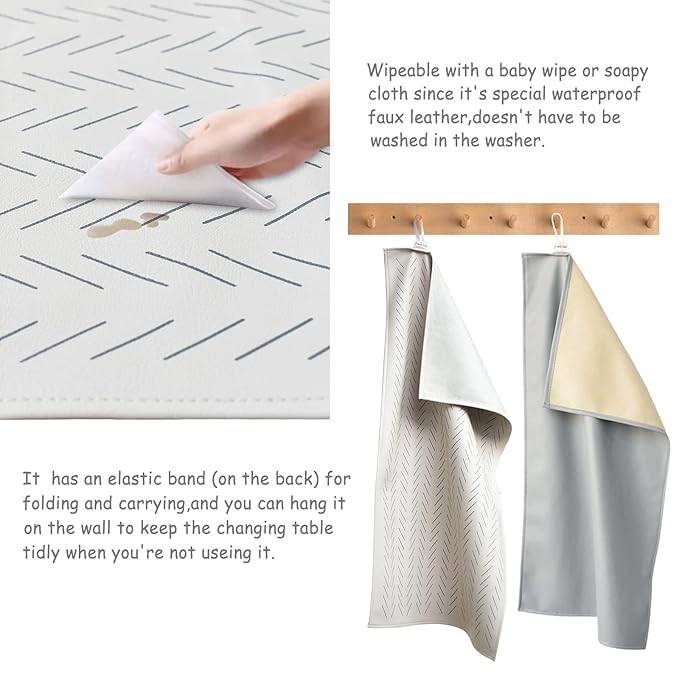 - EASY TO USE AND CLEAN:This portable changing pad can be easily folded and taken with you on the go,it's super easy to wipe down because it is made of waterproof leather material and doesn't have to be washed in the washer.It also has a elastic band (on the back) for folding and carrying,and you can hang it on the wall to keep the changing table tidly when you're not useing it