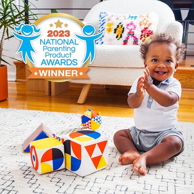 - Baby Bauhaus: featuring a vibrant high-contrast color palette and soft, sensitivity-rich materials that are sure to captivate your baby's curious mind and nimble fingers. These jumbo blocks are thoughtfully designed to engage babies from birth to 18 months, making them a lovely addition to your child's early development.