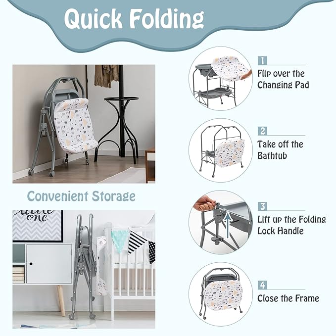 BABY JOY Baby Bathtub with Changing Table, Foldable Infant Diaper Changing Station with Storage Tray, Waterproof Pad, Portable Newborn Nursery Organizer Bath Stand with 4 Universal Wheels (Gray)