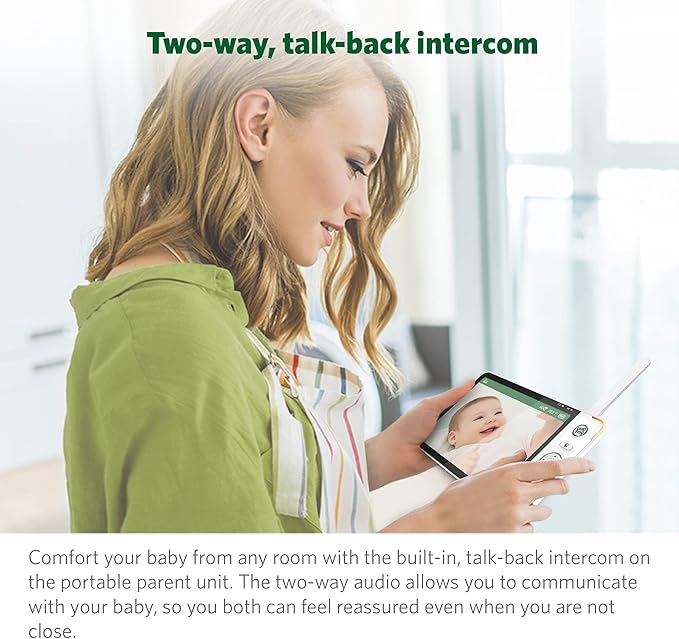 - 【TWO-WAY, TALK-BACK INTERCOM】- Sometimes all your baby needs is to hear the sound of your voice. Comfort your infant from any room with the built-in intercom on the portable parent viewer.