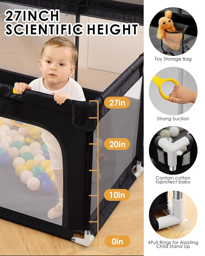 - Safety baby playpen: Playpens are made of resistant-duty encryption Oxford cloth material & strong fabrics net siding, BPA-free,,with 4 TPR suction cup bases are well strengthen the stability. Thicker sponge and soft cloth have been added to prevent children from being hit while playing. More safe more free.