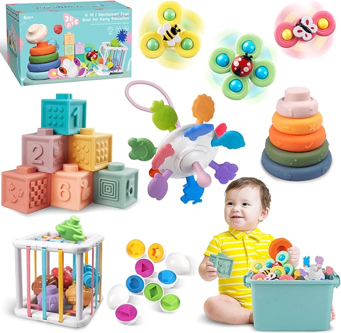- 6 in 1 Baby Toys Set: This montessori toys set contains 6 soft building blocks, 5 soft stacking rings, 6 matching eggs, 3 suction cup spinner toy, 1 crab shape sensory toy, 1 explore sensory bin with 6 blocks. Comes with a large capacity storage bin for children to learn organizing skills. Nicely packaged, great gift choice for babies