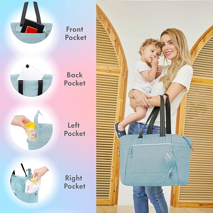 Dikaslon Diaper Bag Tote, Large Travel diaper tote for Mom and Dad, Multifunction baby tote bag for Boys and Girls with Pacifier Case and Changing Pad, Light Blue