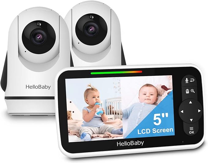 HelloBaby Video Baby Monitor with 2 Cameras and 5 Inch Split Screen Display, Remote Control Cameras with Night Vision and Temprature Monitoring