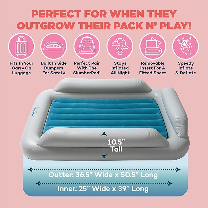 - Versatile Usage: Great for sleepovers, visits to Grandma's, vacations, and more, SlumberTot provides a soft-touch sleep surface with integrated side rails, ensuring air-filled comfort and peace of mind for your little ones.
