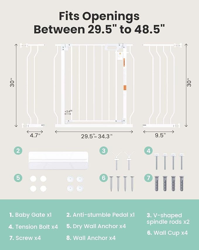 Mom's Choice-GROWNSY Baby Gate for Stairs, 29.5"-48.4" Pressure Mounted Baby Gate for Top of Stair&Doorway with V-Shaped Rods, Anti-Trip Pedal, Extra Wide Stairs Dog Gate Easy Install w/Red Reminder
