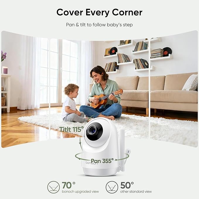 - 【Entire Room Coverage】- Keep an eye on your baby from anywhere in your home with our video baby monitor. The baby camera lens pans 355° and tilts 115° to capture all corners of the room, while 4x zoom lets you get a closer look. You'll never miss a thing, even if your baby escapes the crib. Enjoy a clear and stable live stream with wireless coverage, and capture baby's growth moments!