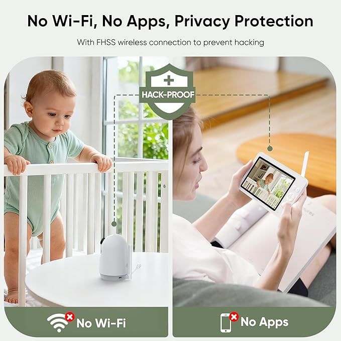 - 【No Wi-Fi, Secure and Reliable】- The 2.4GHz FHSS connection technology ensures a secure and private live stream that is only for you. Protect you and your family from privacy leakage with our non-WiFi baby monitor. No WiFi, No APP downloading, or account creation is required.