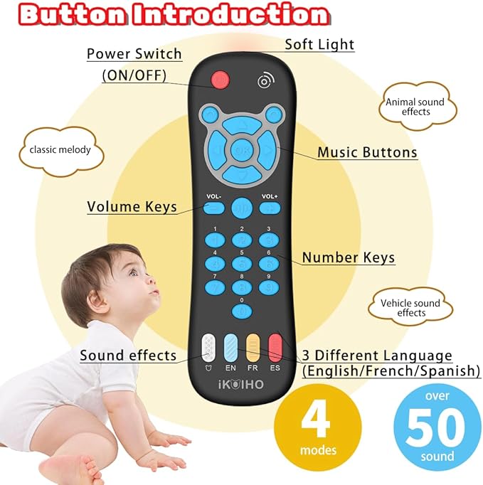 - Early Educational Toys: Pressing different keys of this fake remote to switch over 50 different music, numbers, animal sounds and other sound effects. This kid remote toy has three languages, English, French and Spanish, improve baby's cognition of numbers and language learning ability, babies can learn while playing this pretend play toy.