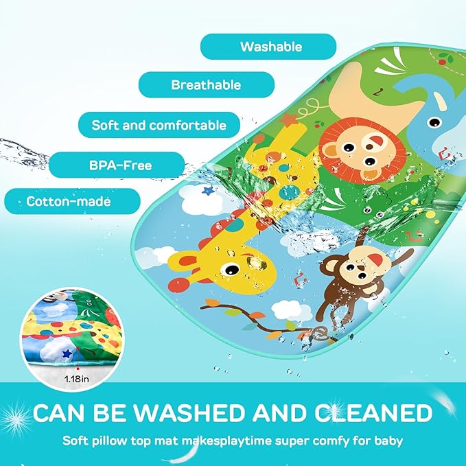 - Baby Tummy Time Playmat Support: The soft, cushioned baby activity mat beneath the infant activity gym provides a comfortable and safe space for tummy time mats for babies 0-6 months, a crucial activity mat newborn toys for building upper body strength and head control in infant play mats 0-6 months.