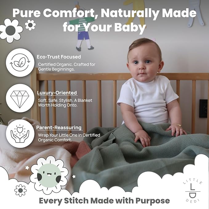 - Special Feature : [GOTS-CERTIFIED ORGANIC COTTON]: Crafted from 100% organic cotton, ensuring hypoallergenic and chemical-free comfort for delicate baby skin, setting it apart from conventional blankets., [MADE IN TÜRKİYE AT A SUSTAINABLE FACTORY]: Produced in a next-generation, eco-friendly factory that combines traditional craftsmanship with innovative sustainability practices, ensuring ethical and high-quality production., [PREMIUM VEGAN LEATHER TAG]: Includes a sophisticated vegan leather tag, blending sustainability with a modern, luxurious touch rarely seen in baby blankets., [REUSABLE GIFT BOX PACKAGING]: Packaged in a durable and elegant gift box, ideal for gifting and reusability, offering eco-conscious value beyond the blanket itself., [TIMELESS PREWASHED KNIT DESIGN]: Featuring a classic knit pattern that combines elegance with durability, making it a standout choice for style-conscious parents. [GOTS-CERTIFIED ORGANIC COTTON]: Crafted from 100% organic cotton, ensuring hypoallergenic and chemical-free comfort for delicate baby skin, setting it apart from conv… See more