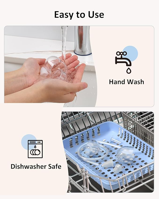 - HASSLE-FREE CLEANING: Experience the convenience of our dishwasher-safe baby nasal aspirator. Designed for effortless maintenance, its transparent suction chamber and tubing detach with ease for a quick rinse under clean water, ensuring hygienic and efficient cleaning every time.