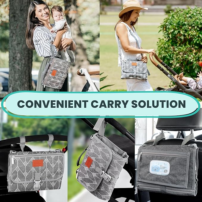 - Convenient carry solution - Our portable changing pad's versatile straps provide seamless attachment to strollers, car headrests, and bags. Offering multiple carrying options, it can be used as a clutch bag and also as a shoulder bag. This multi-purpose handle ensures easy and convenient carrying, making it the ideal solution for parents on the move—versatile, adaptable, and ready for any situation.