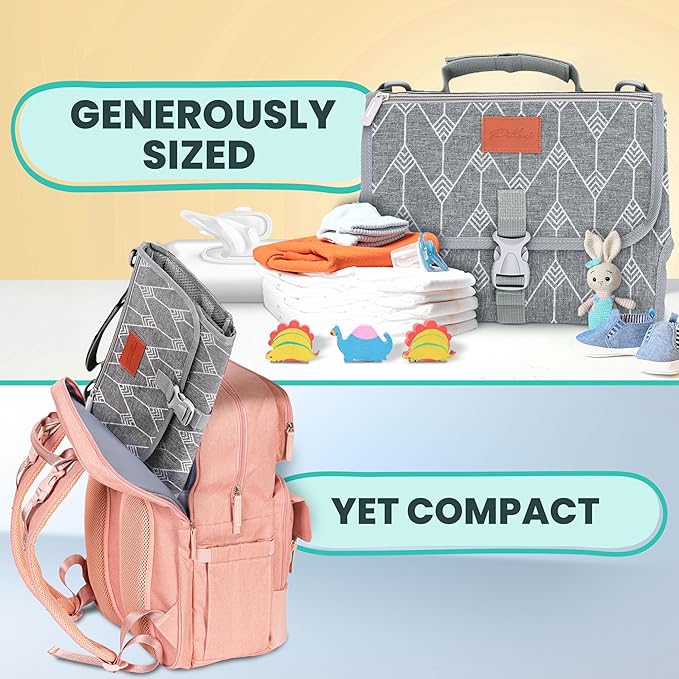 - Generously Sized yet Compact: Organized baby essentials with 2 inner mesh pockets, front storage bag (key holder and outer pocket), and easy-access wipes holder. Experience hassle-free diaper changes blending versatility and comfort. Our diaper changing mat is padded with a soft memory foam pillow. You can detach this extra storage space when you just need a simple changing pad! Equipped with a spacious 27” by 22” changing area, it folds into a compact 8" by 11" clutch for easy storage.