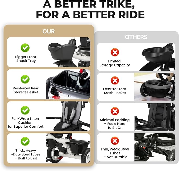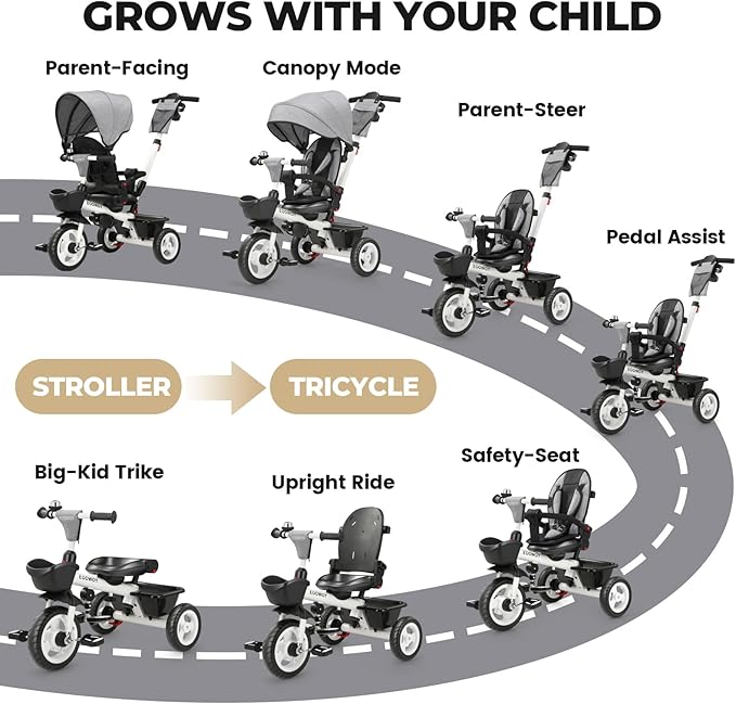 - 6 IN 1 TRICYCLE: With multifunction design, this big kids tricycle & outdoor toys for toddlers can be transformed into 6 modes of use, This baby trike can grow up with a child from 18 months to 5 years which will be a rewarding investment for your child's childhood. Our 6 in 1 kids trikes for toddlers will be one of the good memories of you kids’childhood.