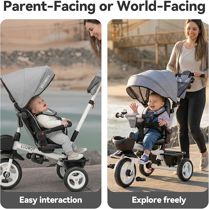 - REAR-FACING INFANT SEAT: The tricycle bicycles for baby seat can be adjusted and reversed to allow your curious baby to interact with you face to face or observe the nature on the go; multiposition backrest can be adjusted from 100°to 120° (120°for rear facing seat), to find the perfect position for your tricycle for kids comfort.