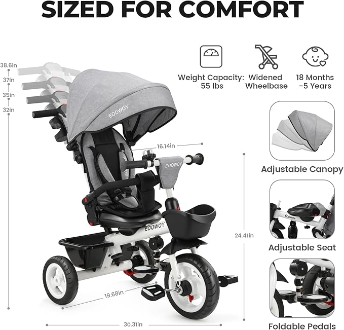 - SAFETY DESIGN: The 3-point safety harness on the kid tricycle seat provides the perfect combination of comfort and child safety. Detachable safety bar, double brakes, anti-UV canopy, all of these ensure a fuss-free ride for your baby with this toys for 18 months to 5 years old.
