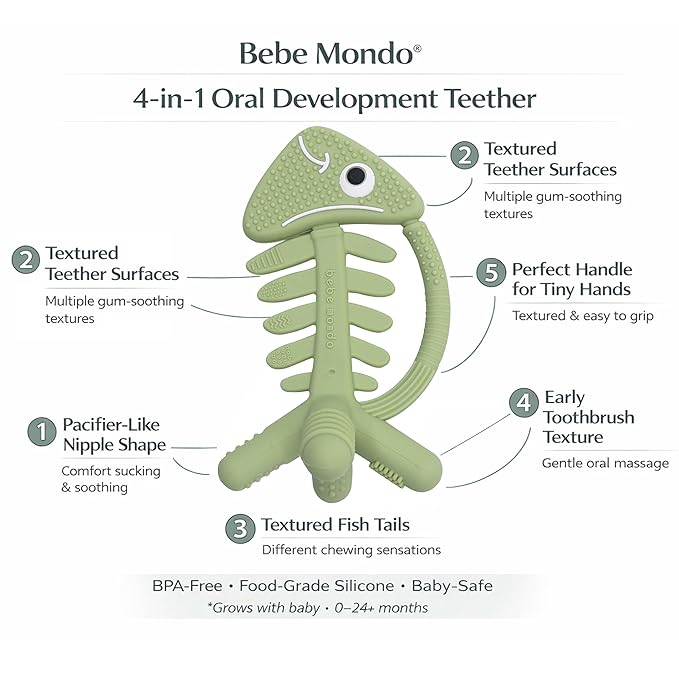 - Designed With Pediatric Dentists: Created by baby-toy specialists and pediatric dentists, this double-sided silicone teething toy features textured fins, tail, head, and bones to massage gums safely. Made from premium, odor-free, food-grade silicone. Super soft baby teethers (11 colors). ASTM & CPC tested, BPA-free, dishwasher and freezer safe.