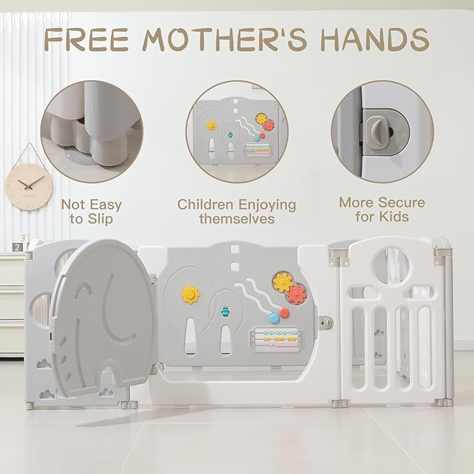 - Sturdy and Secure: Safety is our priority. Our playpen features hinge connectors, anti-slip pads, and a secure door lock to ensure your child's safety.