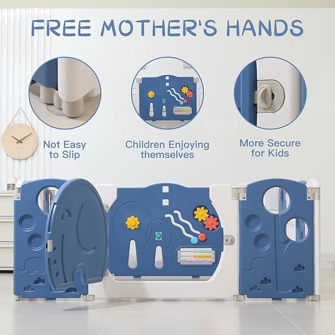 - Sturdy and Secure: Safety is our priority. Our playpen features hinge connectors, anti-slip pads, and a secure door lock to ensure your child's safety.