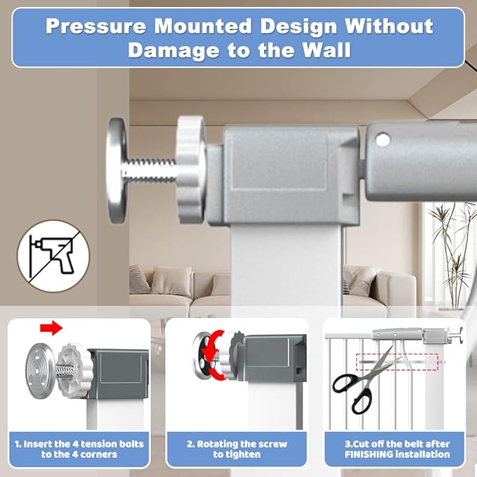 - 3.【Pressure Mounted Dog Gate】This dog door is used by pressure mounted installation.Add pressure bolts on the bottom and top sides of the pet gate for cats without tools or drilling.It won't cause damage to your door or wall.Please don't cut off the plastic ties before installation.