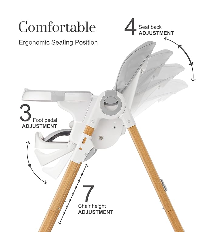 - ADJUSTABLE HEIGHTS, BACKREST & PEDAL: Our high chairs for babies and toddlers has three-level foot adjustment, seven-level seat adjustment and four-level backrest adjustment, adapting to different heights and needs of babies. The use of buttons can be quickly adjusted and converted.