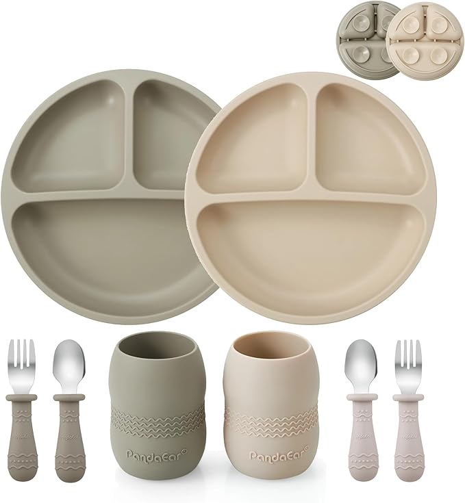 PandaEar Silicone Baby Feeding Set| 2 Pack Silicone Divided Suction Plate and 2 Pack Tiny Cup with 2 Spoons 2 Forks| Baby Led Weaning Supplies Self Feeding Eating Utensils (Silverware Set)