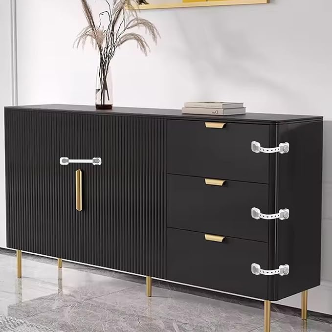 - Adjustable Flexible Safety Straps: Cabinet Strap Locks are designed with 10 belts holes and a smart adjust locks buttons, flexible safety straps can be cut any length to fit any size shapes appliances and furniture. (Total length 8.5 inches)