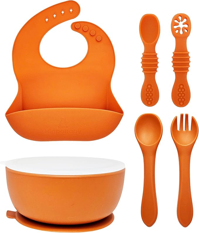 - ENHANCE SELF-FEEDING – Make mealtimes a breeze with HippoBaby suction bowls and baby self feeding spoon & fork set at home or on the go. This silicone baby feeding set encourages your child's independence at mealtime. It includes one 12 oz suction bowl with lid, 1 Bib, 2 Baby Spoons, 1 Large Spoon, 1 Large Fork, Baby Feeding Essentials.