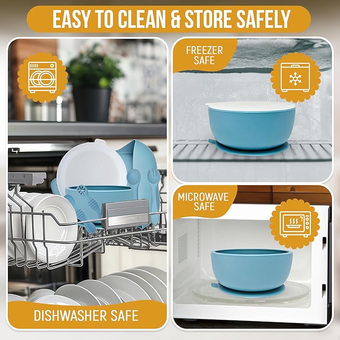 - SAFE FOR YOUR BABY - Made from 100% food-grade silicone, these toddler plates and toddler utensils are free from BPA, PVC, and other harmful ingredients. They’re unbreakable and 100% safe for use in microwaves, dishwashers, and freezers and easy to clean. The baby weaning suction bowls with lids will never crack, melt or loose their shape in the dishwasher or microwave!
