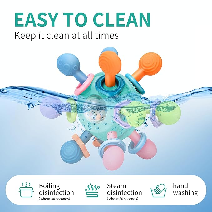 - Easy to Clean: Baby teething ball needs to be thoroughly sterilized before use by babies aged 0-6 months and 6-12 months. Baby sensory chew toys is made from heat-resistant materials and can be sterilized using ultraviolet light, boiling water, and steam. Note: Do not soak in boiling water for more than 1 minute.