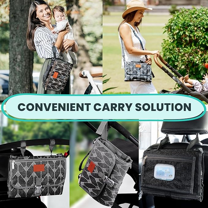 - Convenient carry solution - Our portable changing pad's versatile straps provide seamless attachment to strollers, car headrests, and bags. Offering multiple carrying options, it can be used as a clutch bag and also as a shoulder bag. This multi-purpose handle ensures easy and convenient carrying, making it the ideal solution for parents on the move—versatile, adaptable, and ready for any situation.