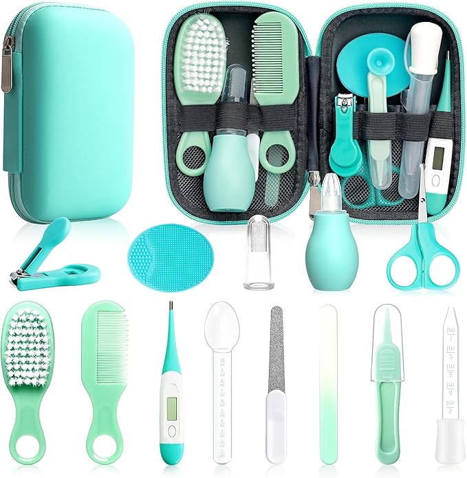 Baby Healthcare and Grooming Kit, 14 in 1 Baby Safety Set Newborn Nursery Health Care Set with Hair Brush Scale Nail Clippers for Baby Girls Boys(14 Kits Green)