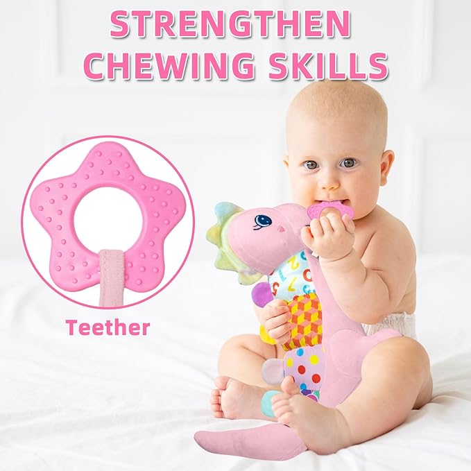 - SAFE & FRIENDLY NEWBORN TOY: The dinosaur baby girl toy is made of high-quality plush, safe, BPA-free, odor-free, and has no moving parts. It is made of soft fabric that babies aged 0-6 months like. It uses high-quality pp elastic cotton. It feels comfortable and elastic when holding. The teether on the chest can be safely let the baby chew gently to relieve the discomfort of teething.