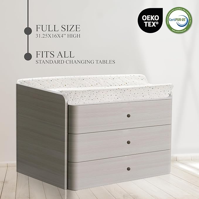 Organic Cotton Contoured Baby Changing Pad w/Waterproof Foam Mattress, Includes Soft, Removable & Washable Cover, Safety Strap, Non-Slip Bottom, Topper for Standard Size Infant Diaper Table & Dresser