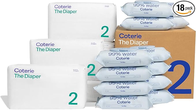 Coterie Baby Wipes + Diapers Kit, Size 2 Diapers (186 Count) & 12 Pack (672 Count) Baby Wipes with 99% Water, Plant Based Materials, Hypoallergenic for Sensitive Skin